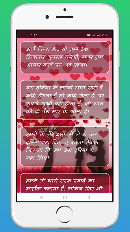 This app contains following category like best wishes Shayari, Good Morning shayari, Love Shayari, Friend Shayari, Attitude Shayari, Emoji Shayari, Funny Shayari, Birthday Shayari, Romantic Shayari, Life Shayari, Sad Shayari, Happy Shayari, Dard Shayari, Intezar Shayari, Bewafa Shayari, Navratri Shayari, New Year Shayari, Chrismas Shayari, Republicday Shayari, Valentine Shayari, Diwali Shayari, etc.