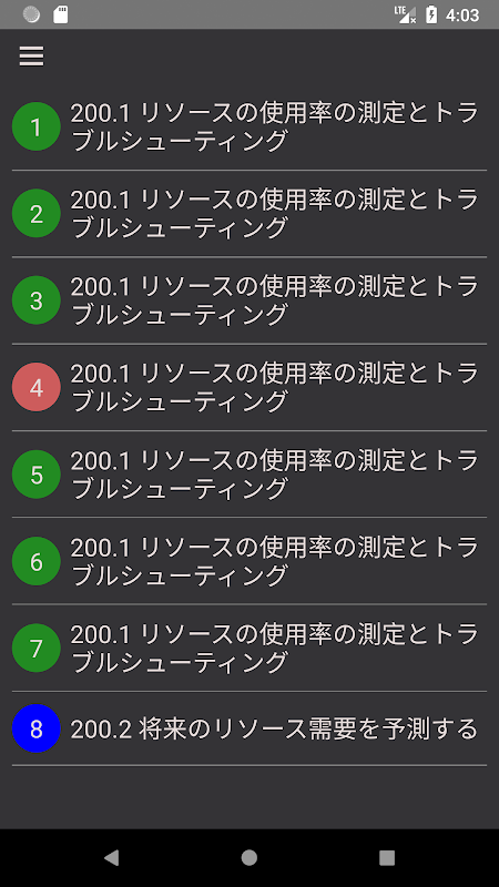 * 例題一覧では、正しく解答できた問題を緑、誤って解答した問題を赤、未解答の問題を青で表示します。