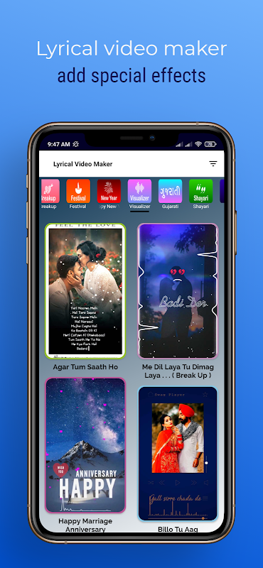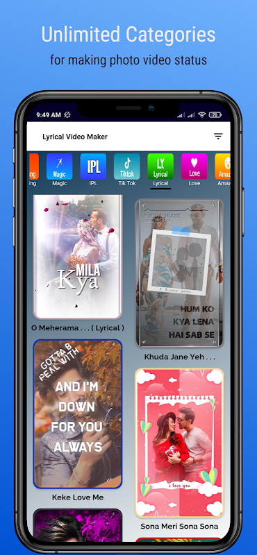 Lyrical Video Status Maker-lyrical photo video status maker with music has huge lyrical video song library, you'll select your favorite video and make one romantic song in just 1 minute