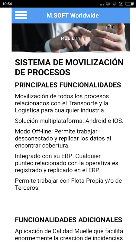 M.SOFT Worldwide telah menjadi pengembang dan pelaksana solusinya sendiri sejak tahun 1989, dengan dedikasi eksklusif untuk Sistem Informasi Bisnis (ERP /TMS/WMS) dan perangkat lunak mobilisasi proses (MOBILITAS) untuk sektor Transportasi, Logistik dan seluruh industri pada umumnya . Untuk ini kami menawarkan kerangka kerja yang dapat diskalakan, dengan solusi andal dan teruji secara luas yang dipasang di basis klien kami dan selalu disesuaikan dengan teknologi terbaru dan kebutuhan pasar.