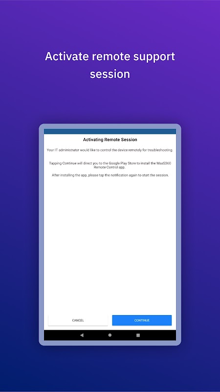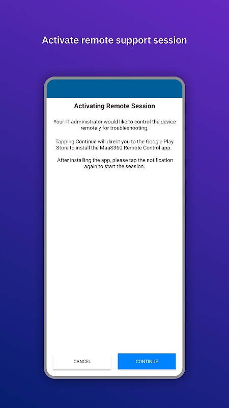 Dukungan Jarak Jauh IBM MaaS360 adalah modul untuk IBM MaaS360. Add-on ini memungkinkan meja bantuan TI Anda untuk masuk ke perangkat Anda dan membantu memecahkan masalah apa pun yang mungkin Anda alami dari jarak jauh. Untuk perangkat Samsung, hal ini memungkinkan kemampuan untuk melihat dan mengontrol perangkat dari jarak jauh. Sedangkan untuk perangkat lain, ini memberikan kemampuan untuk melihat perangkat dari jarak jauh saja. Izin harus diberikan kepada TI sebelum mereka dapat mengontrol perangkat Anda. Memerlukan IBM MaaS360 dan akun dengan IBM MaaS360.