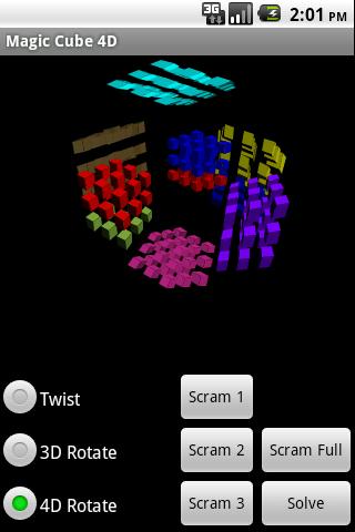 MC4D adalah analog asli dari Rubik's Cube dalam empat dimensi. Ketuk hyper-face (blok hypersticker berukuran 3x3x3) untuk memutar face tersebut ke tengah. Gunakan tombol untuk mengacak 1, 2, atau 3 putaran acak lalu coba batalkan putaran tersebut kembali ke keadaan terpecahkan. Atau tekan item menu "Selesaikan" dan lihat aplikasi melakukannya.