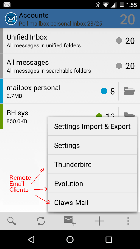 MailPlex is like a hub system from which you can run K9, Thunderbird, Evolution and Claws-Mail. The last three are run remotely. Note that in order to use this app for the last three clients you must use the following actions with your fingers: