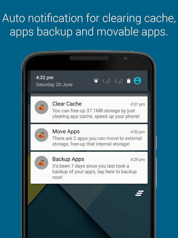 * Automatic notification on installation of movable app with customizable ringtone, vibration feedback and led notification.