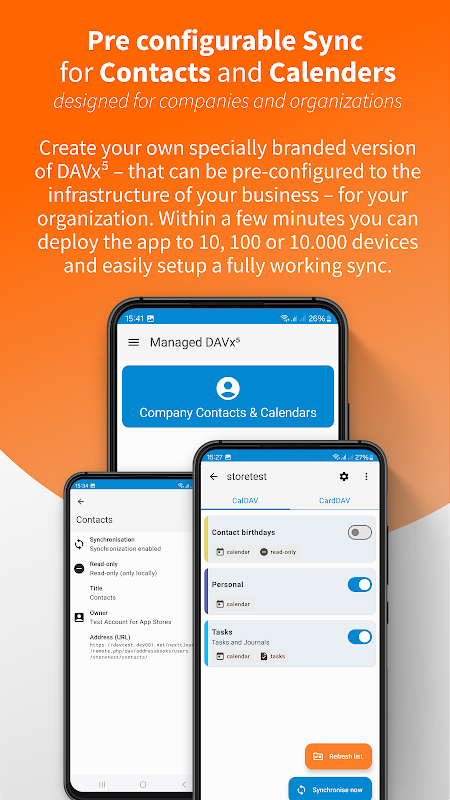DAVx⁵ Terkelola memiliki kemampuan sinkronisasi mengagumkan yang sama dengan DAVx⁵ asli, namun hadir dengan fitur tambahan yang hebat untuk bisnis dan organisasi. Terutama versi ini ditujukan untuk diluncurkan bagi karyawan organisasi yang ingin CalDAV & CardDAV tersedia di perangkat Android. DAVx⁵ yang dikelola harus dikonfigurasi sebelumnya oleh admin. Hal ini dapat dilakukan dalam hitungan menit - dan tidak diperlukan pemrograman!