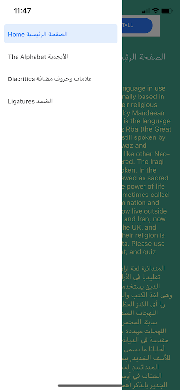 Mandaic adalah bahasa Aram tenggara yang digunakan oleh komunitas Mandaean, yang secara tradisional berbasis di bagian selatan Irak dan Iran, untuk buku-buku agama mereka. Bahasa Mandaik Klasik masih digunakan oleh para imam Mandaean sebagai bahasa liturgi, dan itu adalah bahasa kitab suci mereka, termasuk Ginz Rba (Harta Karun Agung). Dialek neo-mandaik masih digunakan oleh beberapa kelompok kecil, terutama di Ahwaz dan Khorramshahr (Iran). Varietas ini, seperti varietas Neo-Aram lainnya, sangat terancam punah. Dialek Irak diyakini tidak lagi diucapkan. Dalam agama Mandaean, alfabet dianggap suci dan magis. Dikatakan mewakili kekuatan kehidupan dan cahaya. Mandaean juga kadang-kadang disebut Sabian. Sayangnya, karena diskriminasi dan pembersihan etnis, banyak orang Mandaean sekarang tinggal di luar tanah asal mereka di Irak selatan dan Iran, sekarang tinggal di Australia, Amerika Utara, Inggris, dan Skandinavia. Salah satu ciri penting dari agama mereka adalah pentingnya pembaptisan, atau Maṣbuta. Silakan gunakan aplikasi ini untuk mempelajari alfabet Mandaic, dan kuis sendiri tentang huruf-hurufnya.