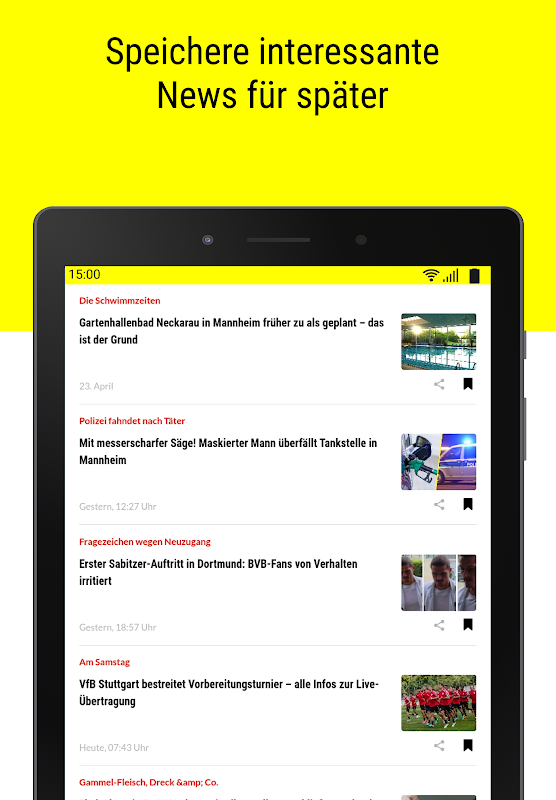 Dengan fungsi pesan push opsional, Anda akan diberi tahu tentang semua berita terbaru. Selain itu, Anda sekarang dapat menyimpan laporan menarik menggunakan fungsi bookmark dan mengaksesnya nanti di daftar pantauan Anda, serta berbagi semua artikel dengan teman Anda.