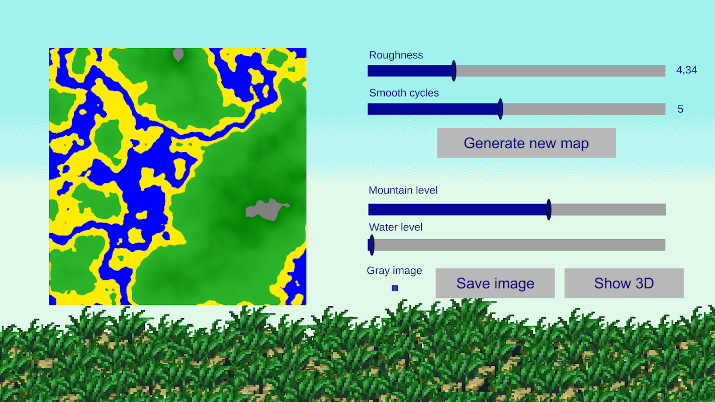 Aplikasi ini menggunakan algoritma berlian-persegi untuk menghasilkan peta ketinggian acak. Anda dapat mengubah kekasaran dan nomor siklus halus untuk mempengaruhi hasil akhir.