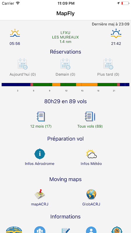 - préparer un vol en accédant aux informations liste des aérodromes, VAC, METAR, NOTAM, ATIS, avitaillements, cartes météo, heures de lever et coucher du soleil, cartes SIV, activité RTBA, ...