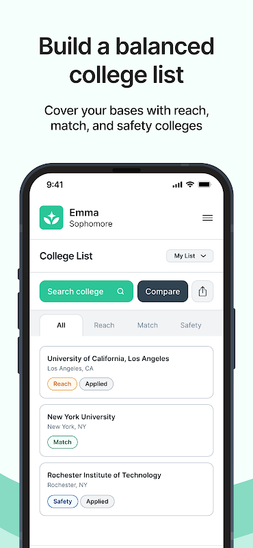 - Pembuat Daftar Perguruan Tinggi: Sederhanakan perbandingan perguruan tinggi, lacak tenggat waktu, dan atur sekolah ke dalam kategori jangkauan, kecocokan, dan keamanan untuk strategi pendaftaran yang menyeluruh.