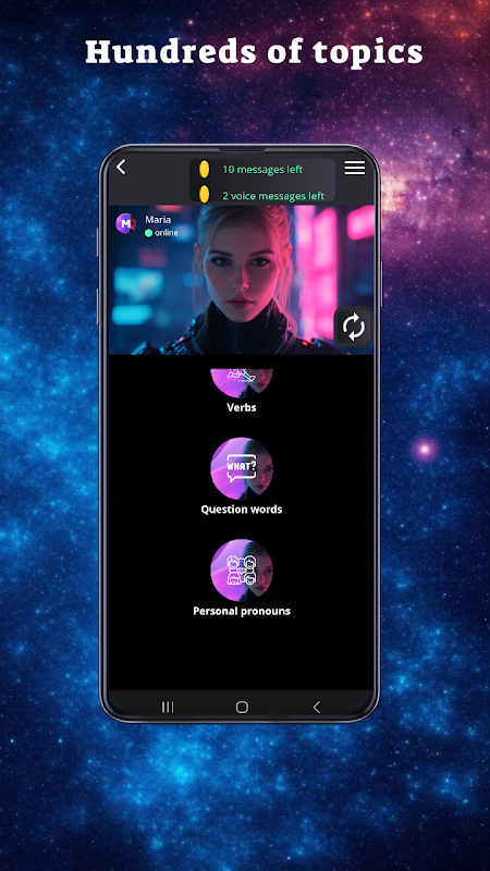 ✅ Pelajari Topik Apa Pun – Dari percakapan sehari-hari hingga percakapan bisnis, frasa perjalanan, pengantar, kata kerja, dan banyak lagi! ✅ Bicara & Ngobrol – Berkorespondensi atau bicara dengan guru AI Anda dalam percakapan yang alami dan menarik.