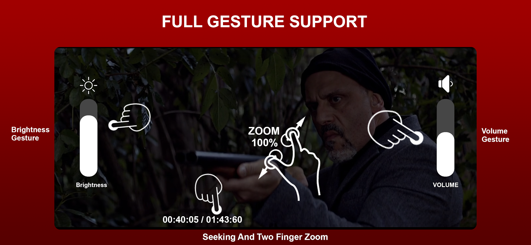 GESTURES: Mengontrol pemutar menggunakan gerakan yaitu Maju/mundur pemutaran, menambah/mengurangi volume dan kecerahan