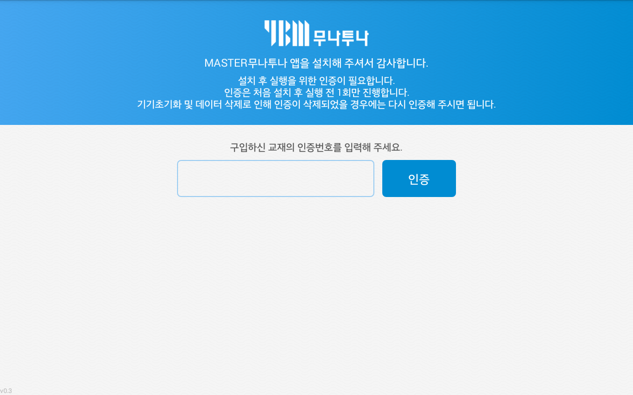 1. Master 무나투나 앱 실행 후 교재에 있는 시리얼 번호를 입력합니다.