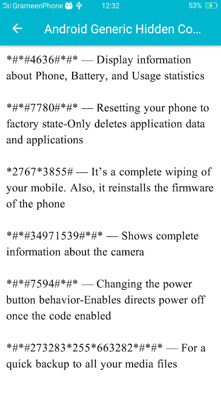 Panduan Untuk Aplikasi Buka Kode Master. Anda akan mendapatkan Kode Rahasia dan Trik Kode Master dari aplikasi ini. Ada banyak pengaturan dan informasi tersembunyi yang tersedia di ponsel Anda yang dapat diakses hanya dengan menekan kode rahasia. Kami harap Anda menemukan aplikasi ini berguna dan membantu Anda.
