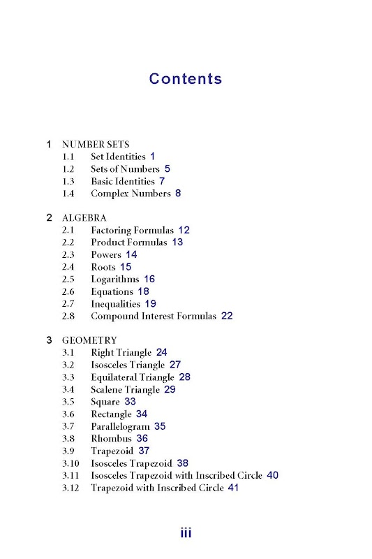 Buku pegangan ini (oleh Alex Svirin Ph.D.) adalah referensi desktop lengkap untuk mahasiswa dan insinyur. Ia memiliki segalanya mulai dari matematika sekolah menengah hingga matematika untuk sarjana tingkat lanjut di bidang teknik, ekonomi, ilmu fisika, dan matematika. Ebook tersebut berisi ratusan rumus, tabel, dan gambar dari Himpunan Bilangan, Aljabar, Geometri, Trigonometri, Matriks dan Determinan, Vektor, Geometri Analitik, Kalkulus, Persamaan Diferensial, Deret, dan Teori Probabilitas. Daftar isi, tautan, dan tata letak yang terstruktur membuat pencarian informasi yang relevan menjadi cepat dan mudah, sehingga dapat digunakan sebagai panduan referensi online sehari-hari.