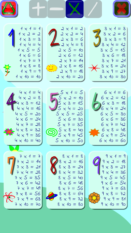 Math tables is an educational app. Its objective is to aid in learning the basic mathematical operation (add, subtract, multiply, divide). Anywhere, anytime, fun and easy!