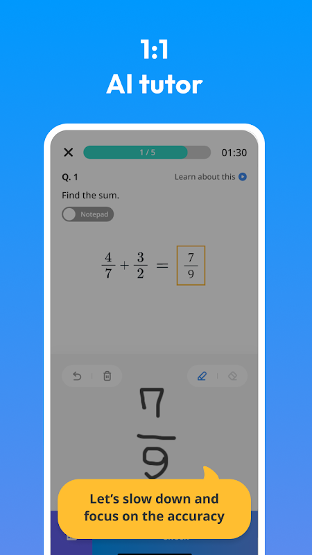 - Detailed analysis reports on learner’s correct answer rate, solving speed, and AI-predicted accuracy rate.