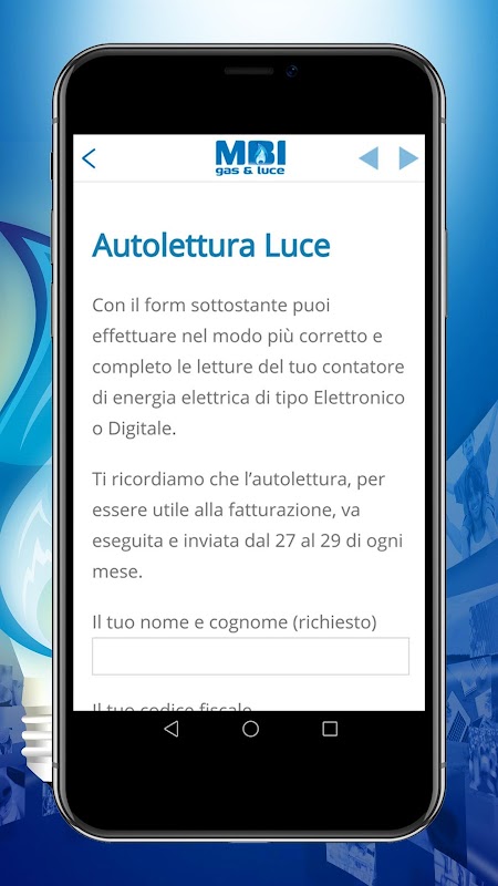 Tramite la nostra app potrai ricevere tutte le nuove offerte proposte da MBI Gas e Luce, inviare l'autolettura del contatore elettrico e del gas, accedere alla tua area riservata, e tanto altro.