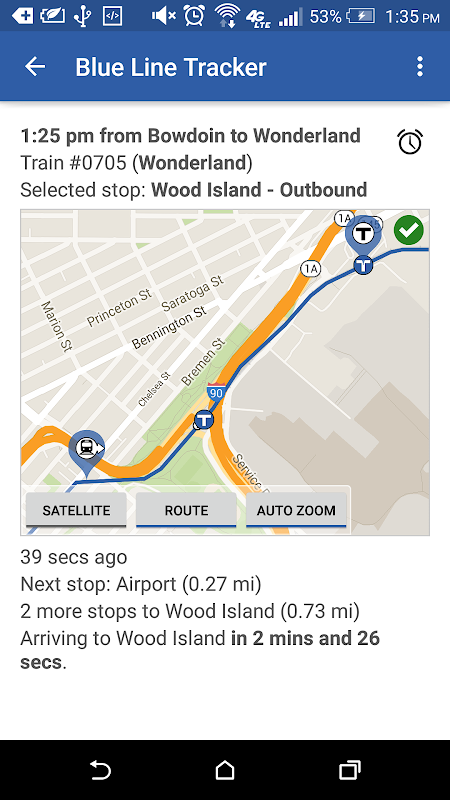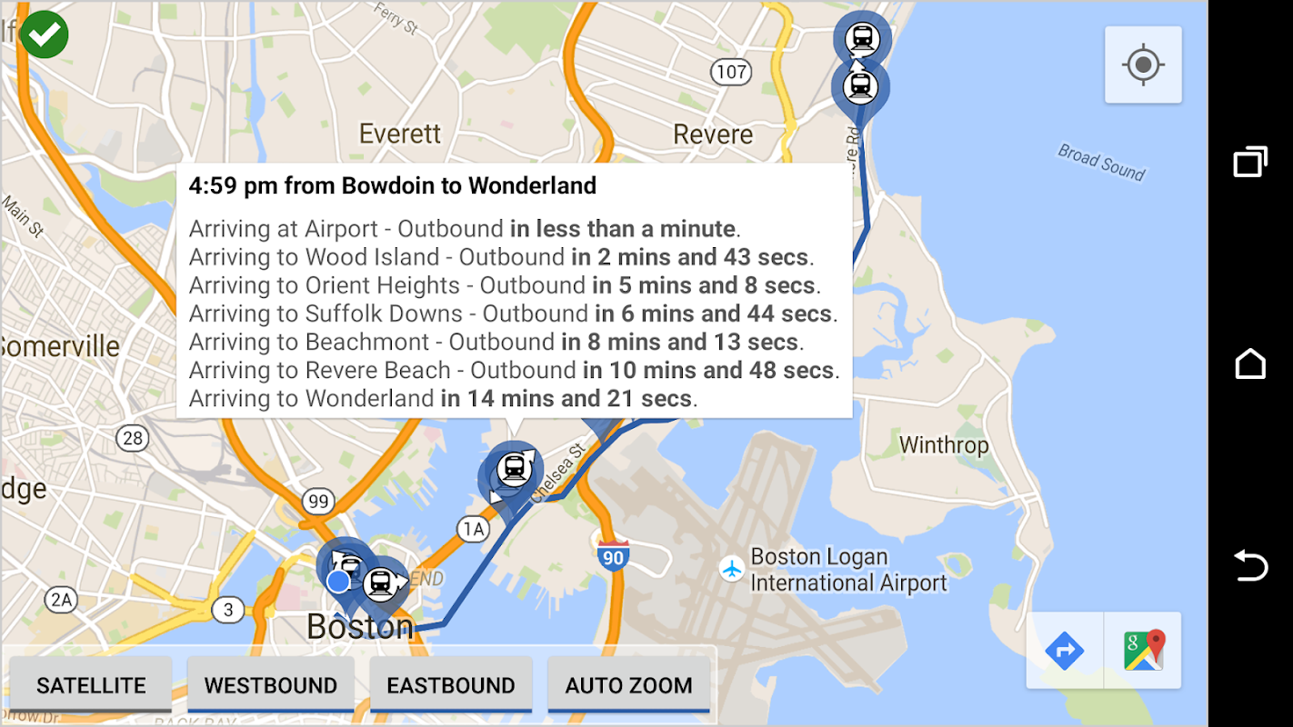This app shows positions of all MBTA Blue Line trains and predicts their arrival time at selected T stop.