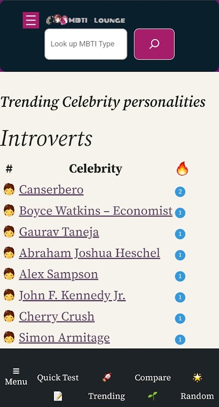 MBTI Lounge is a website that provides information and resources related to the Myers-Briggs Type Indicator (MBTI), a personality assessment tool based on Carl Jung’s theory of psychological type. The website offers an online version of the MBTI test, as well as articles and resources that provide more in-depth information about the different personality types, how the test is used, and how the results can be applied in different settings such as personal development, career development and relationships. The website seems to be a resource for those who want to learn more about their personality type, understand how it impacts their daily life and how to leverage it to reach their goals.