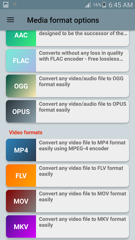 Anda dapat mengkonversi file media Anda ke mp3, FLAC, aac, alac, mkv, flv, mov, mp4 dll