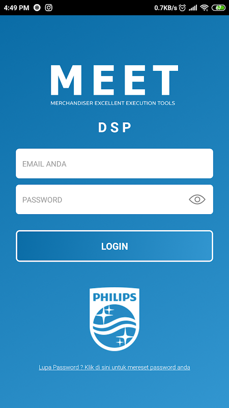 Philips MEET (Merchandiser Excellent Execution Tools) adalah suatu aplikasi yang bertujuan untuk memudahkan Merchandiser Philips dalam melakukan tugas kesehariannya. Aplikasi ini memiliki fitur: