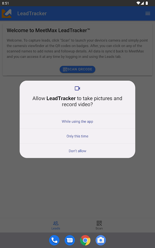 Selamat datang di aplikasi MeetMax LeadTracker, produk Acara TWST. Aplikasi ini memungkinkan Anda menggunakan kamera ponsel Anda untuk memindai kode QR yang telah dibuat pada lencana yang dicetak oleh layanan MeetMax Badging.