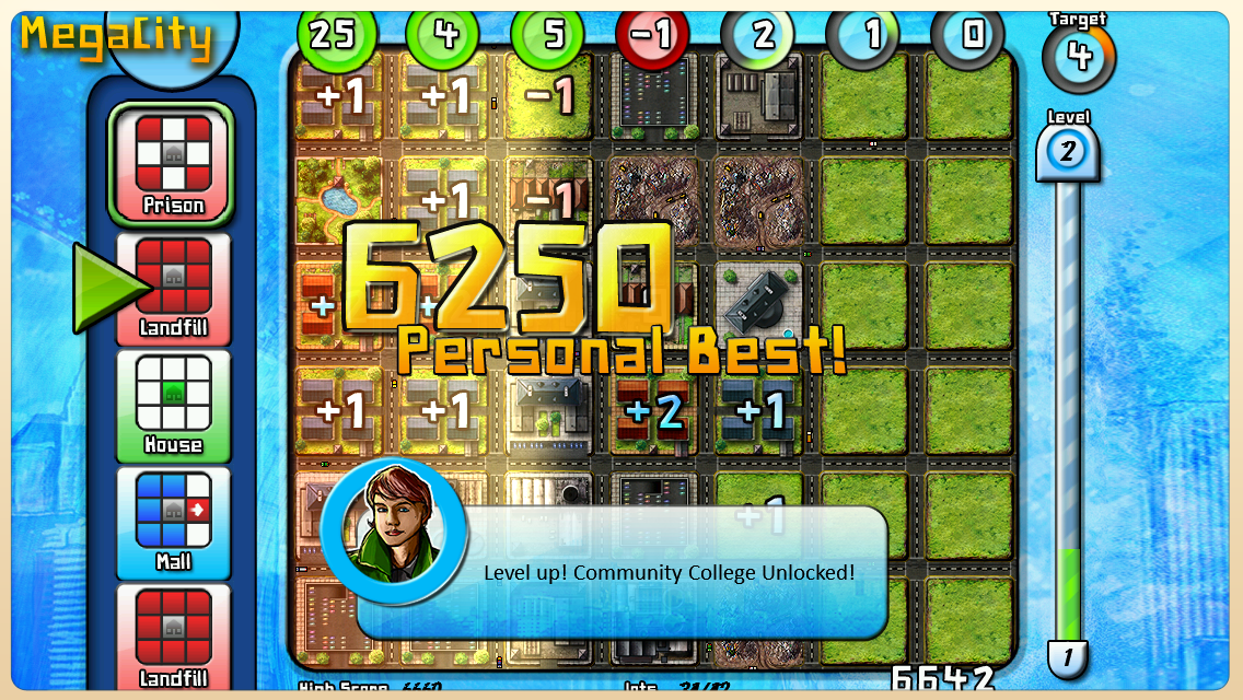 Tempatkan bangunan yang diminta dalam antrian untuk mendapatkan poin, tetapi hati-hati: Tidak ada yang mau tinggal di sebelah lokasi pembuangan sampah atau kawasan industri! Semua orang menginginkan taman atau sekolah yang bagus di dekatnya, tetapi anggaran kota terbatas.