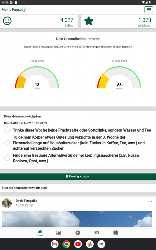 Program digital Meine Pause tersedia gratis bagi karyawan AOK PLUS sebagai bagian dari manajemen kesehatan internal perusahaan. Itu harus dipahami sebagai sumber inspirasi untuk istirahat pendek yang sehat dalam pekerjaan sehari-hari dan berkontribusi pada kesehatan fisik dan mental. Penggunaan bersifat sukarela.