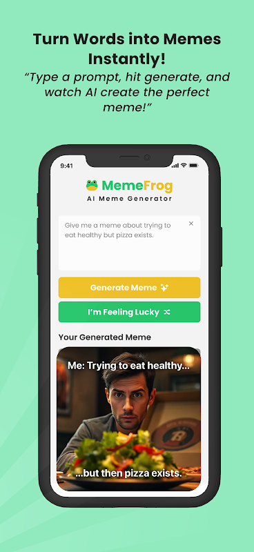 Ketik perintah seperti “Mencoba makan sehat tetapi pizza ada”, dan AI cerdas kami akan langsung membuat meme yang menangkap lelucon tersebut. MemeFrog memahami humor Anda—jadi Anda tidak perlu menghabiskan waktu berjam-jam mencari meme yang sempurna.