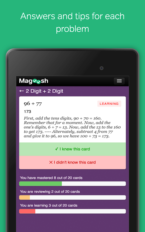 Aplikasi ini memberikan Anda akses gratis ke praktek matematika mental Magoosh online di https://gre.magoosh.com/flashcards/mental-math. Masuk dengan akun Magoosh (atau membuat yang baru) untuk menyimpan kemajuan Anda ke web.