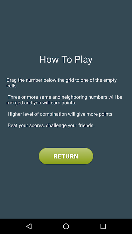 Tujuan dari penggabungan angka adalah untuk mendapatkan poin sebanyak mungkin. Seret angka di bawah kisi ke sel kosong untuk menempatkan angka berikutnya. Angka berikutnya ditampilkan di bawah kisi. Jika Anda menggabungkan tiga atau lebih angka yang sama yang berdekatan, Anda akan membuatnya lebih besar dan mendapatkan poin.