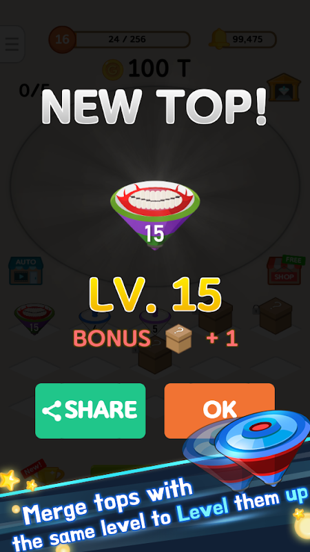 Trying to improve your record in this spinning game? Make sure to merge the tops with the same level to achieve higher levels of the top. The higher level you reach, the more powerful top you will have and the more coins you can collect.
