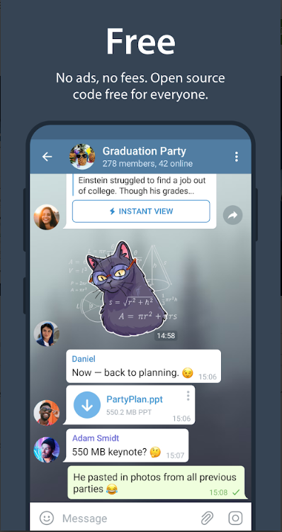POWERFUL: You can create group chats for up to 100,000 members, share large videos, documents of any type (.DOC, .MP3, .ZIP, etc.), and even set up bots for specific tasks. It's the perfect tool for hosting online communities and coordinating teamwork.