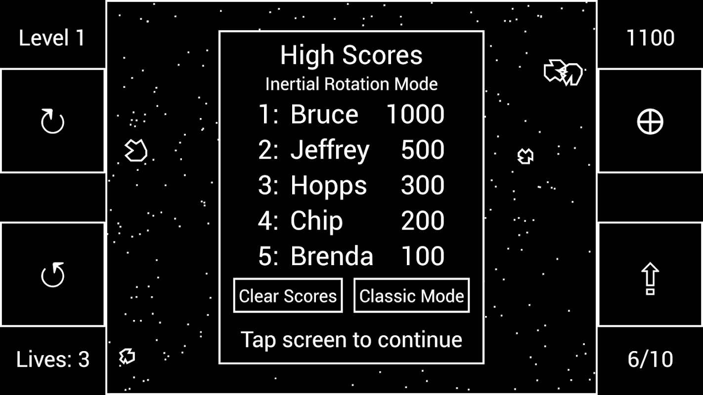 Untuk tantangan tambahan, cobalah mode rotasi inersia, tempat kapal Anda terus berputar begitu Anda mengangkat jari dari tombol. Hindari berjalan terlalu cepat, karena kapal Anda rapuh dan hanya bisa menangani banyak tekanan rotasi.