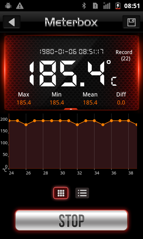 Meterbox iThermo for Android app is the professional industry software, which provides fast, easy and accurate temperature measurement by CEM Professional Infrared Thermometer DT-8889 via Bluetooth, for finding draughts and thermal leaks in buildings/blast-furnace, checking temperatures of engine, coolant, exhaust etc. Meterbox iThermo app enhances user experience about visualization, measuring scene, data logging, data comparing & data sharing.