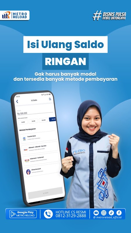 Metro Reload adalah aplikasi yang menyediakan produk pulsa, paket data, paket nelpon, token listrik, voucher tv, dan pembayaran berbagai macam tagihan di seluruh indonesia. Metro Pulsa beroperasi dibawah naungan CV Metro Payment Indotama