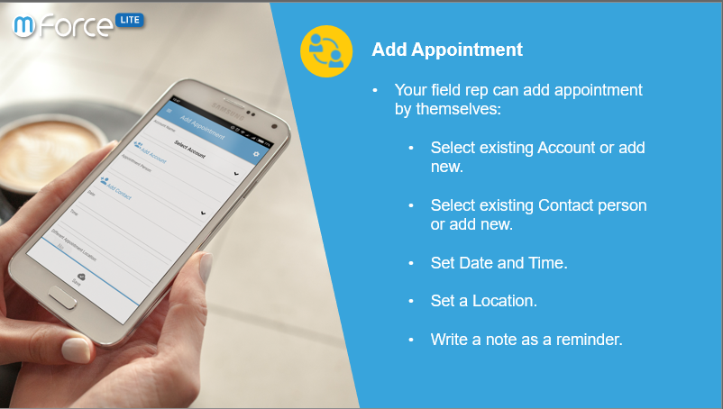 Mforce-LITE memberdayakan perwakilan bidang Anda untuk mengelola bisnis janji mereka, untuk dengan mudah mengambil informasi pelanggan dikodekan dan sejarah janji, untuk melakukan dan memantau kegiatan dan kemajuan mereka, dan untuk menyelesaikan pelaporan mereka seperti membuat risalah rapat dan biaya pengajuan klaim melalui ponsel mereka hanya dengan beberapa klik tombol.