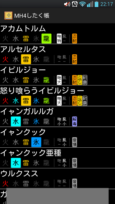 MH4(モンスターハンター4) 出現モンスターの弱点属性をすばやく確認できるアプリです。