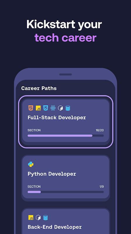 - Tingkatkan karier dengan Full-stack, pengembangan Front-end, Jalur Karier Python, dll.