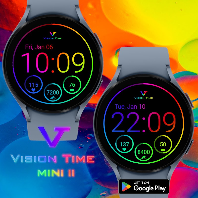 Tampilan jam warna-warni dengan jam digital, tanggal, penghitung langkah, dan monitor detak jantung untuk Wear OS.