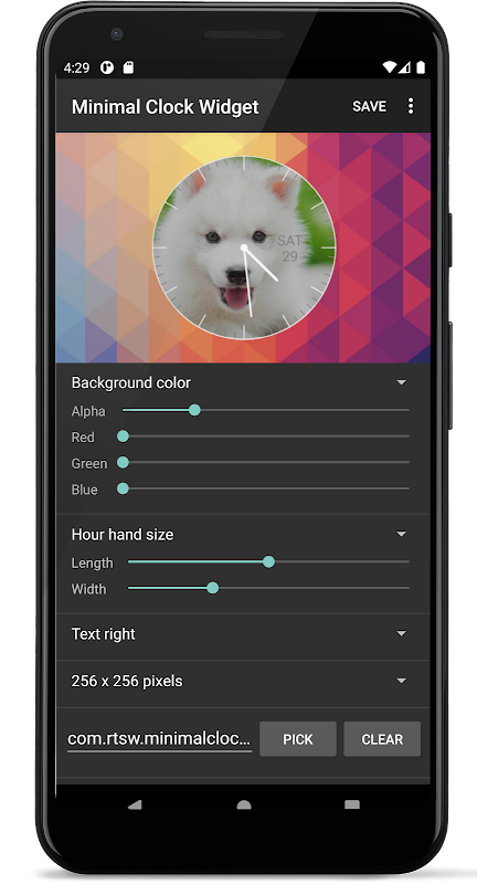 - Sesuaikan warna untuk latar belakang, jarum jam, tanda jam dan menit, teks dan bingkai