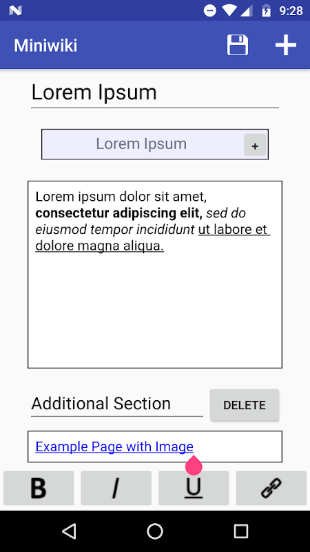 This application allows you to make a personal, private wiki-style notebook for any topic you want. Create pages of text and images and link them together. Ideal for organizing ideas, tasks, and complex projects with many interlocking parts. The application contains a simple editor which supports basic text markup as well as links to other pages. You can dynamically insert additional elements, such as additional page sections and a page header containing an image and data rows.