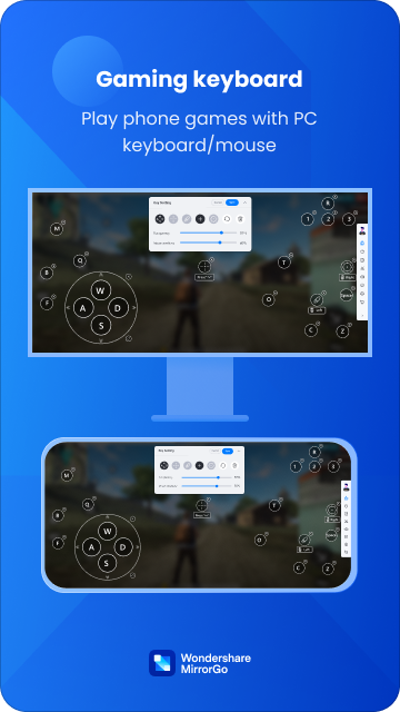 Fitur keyboard gaming MirrorGo memungkinkan Anda memetakan kontrol dan tombol game dari ponsel ke mouse dan tombol keyboard PC. Setelah selesai, Anda dapat memainkan game ponsel dengan mouse dan keyboard PC, mengubah game ponsel apa pun menjadi game PC.