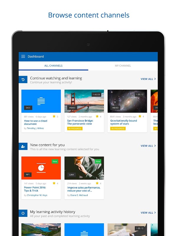 Mobile LMS empowers learners to access learning content any time, anywhere. View Learning Plans, Courses and any learning asset that is made available by your organization. You can now view your content by using Channels, inspired by the way Netflix users browse content. If your LMS Enterprise plan includes Coach and Share, you can also capture and upload videos and photos from your mobile device. Such content will be peer-reviewed, validated and published to the Knowledge Library, which you can browse via the Channels interface.