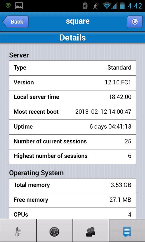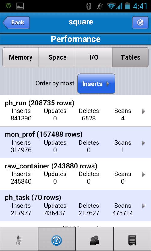 Use the IBM® Mobile OpenAdmin Tool for Informix® to monitor Informix servers (version 11.10 and later) while you're on the move. For example, you can view the online log and information about users such as commits, connection duration, and rows processed. You can find out which tables have the most inserts, updates, deletes, and scans. You can monitor a server's free memory, processor usage, I/O activity, the number of sessions, and more.