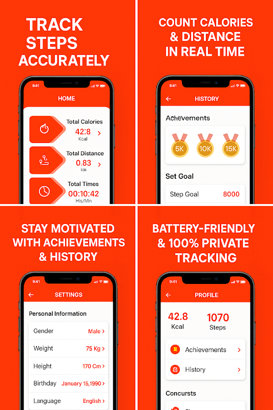 Lacak langkah harian, jarak, kalori, dan waktu aktivitas Anda dengan penghitung langkah yang akurat dan hemat baterai. Aplikasi ini menggunakan sensor gerak bawaan ponsel Anda dan berfungsi tanpa GPS.