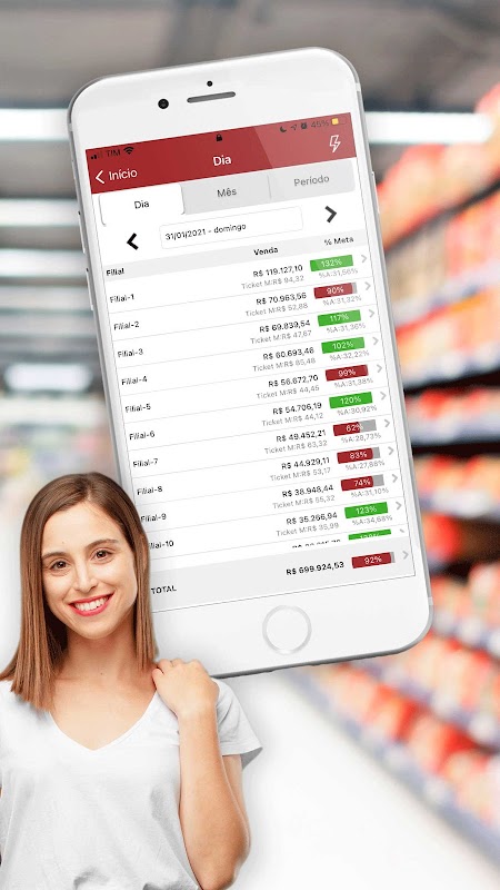 Dengan itu Anda dapat melacak secara real time penjualan oleh toko dan pencapaian tujuan yang telah ditetapkan oleh hari atau bulan.