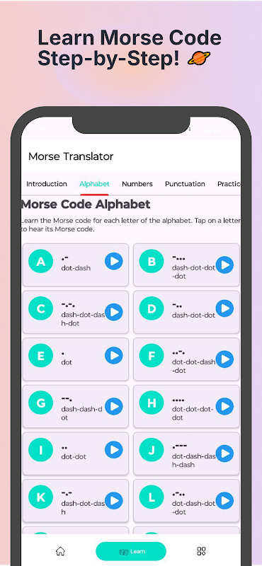 Kuasai kode Morse menggunakan pelajaran dan kuis interaktif.