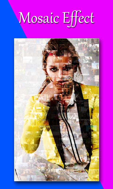 Mosaic Effect : Mosaic Photo Effects, convert your photos into an Art. You can now make a Mosaic Photo just in some few steps. This Mosaic Making app makes high quality mosaic photo collages.